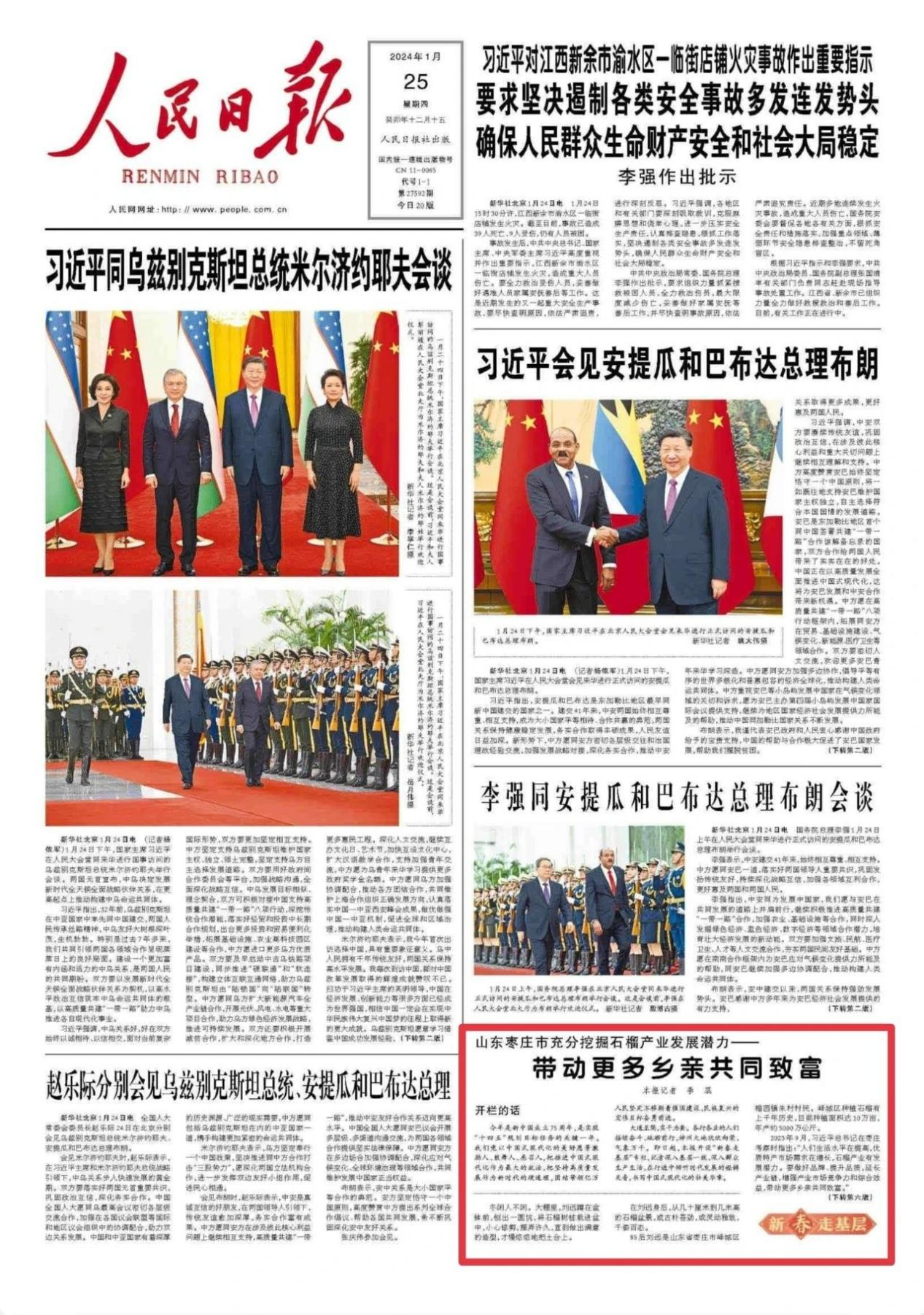 1月25日,人民日报头版“新春走基层”专栏刊发开栏稿件《山东枣庄市充分挖掘石榴产业发展潜力——带动更多乡亲共同致富》,详细介绍了枣庄市深入贯彻落实习近平总书记视察枣庄重要指示精神,将石榴产业纳入全市现代产业体系重点规划,持续做好“土特产”文章,奋力推进乡村振兴的生动实践。