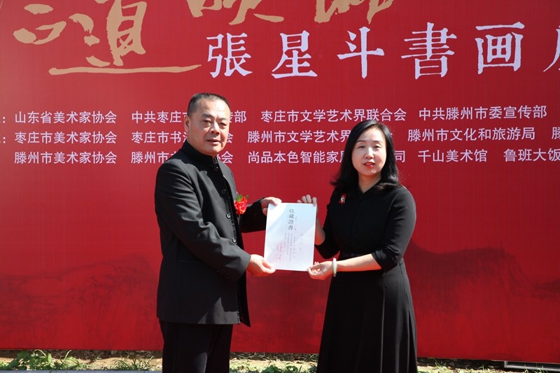 10月13日,由山东省美协、枣庄市委宣传部、滕州市委宣传部联合主办的“含道映物—张星斗书画展”在山东滕州王学仲艺术馆举行。来自山东省文学艺术界的专家学者,相关单位领导嘉宾以及参加开幕式的观众三百余人出席了开幕式。