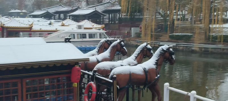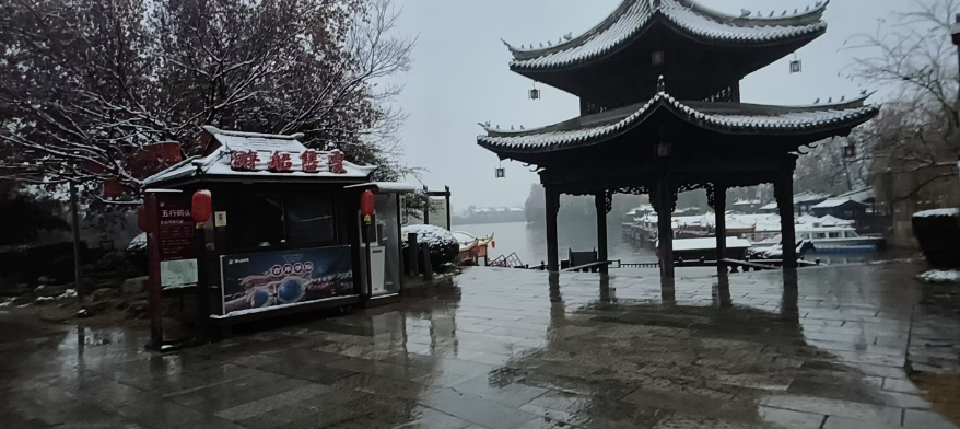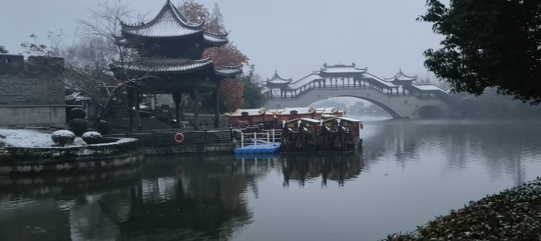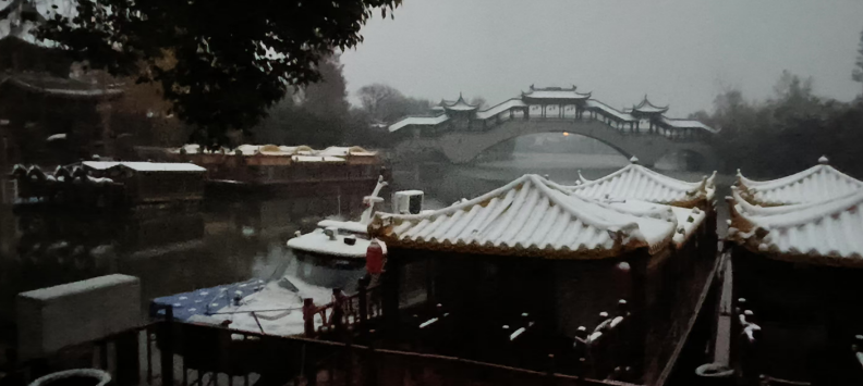 清晨时分,雪花簌簌飘落,古城即刻换上素净新装。青灰瓦檐间,积雪沿飞檐缓缓凝结,串串晶莹冰棱垂挂,与檐下红灯笼相映成景,红白相映间,古朴建筑褪去沉静,添了几分鲜活暖意;古运河面微波轻漾,雪花触水即融,漾开圈圈涟漪,岸边石阶覆着薄雪,水中倒影虚实相生,宛若笔墨淡染的水墨佳作;纵横错落的石桥上,积雪匀铺如毯,脚踏其上,清脆咯吱声入耳,游人纷纷驻足定格,留存与初雪古城的专属邂逅;古街深巷里,青石板路被白雪轻覆,两侧商铺幌子沾着细碎雪粒轻轻摇曳,漫步其间,时光仿佛回溯百年,尽览旧时冬日水乡韵味。